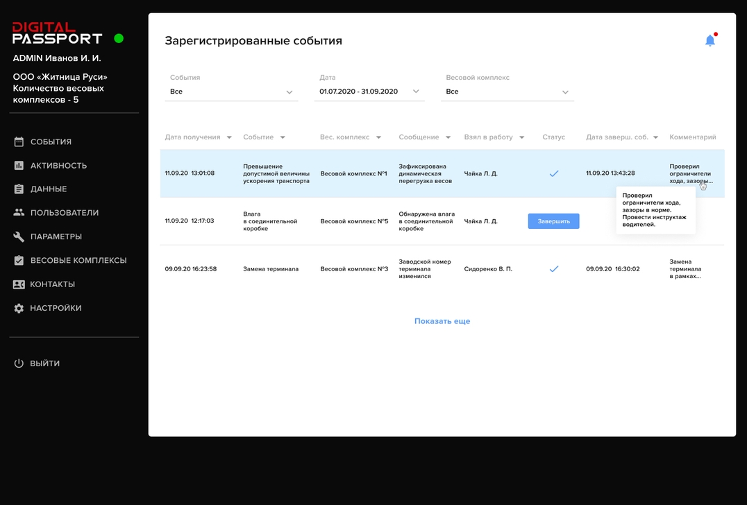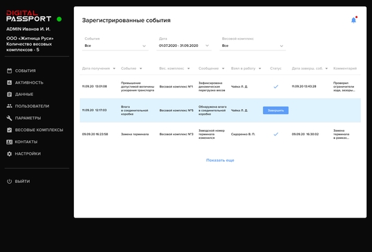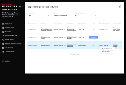 ЦИФРОВОЙ ПАСПОРТ отслеживает все события с терминалом, которые могут привести к потере метрологических характеристик весоизмерительной системы